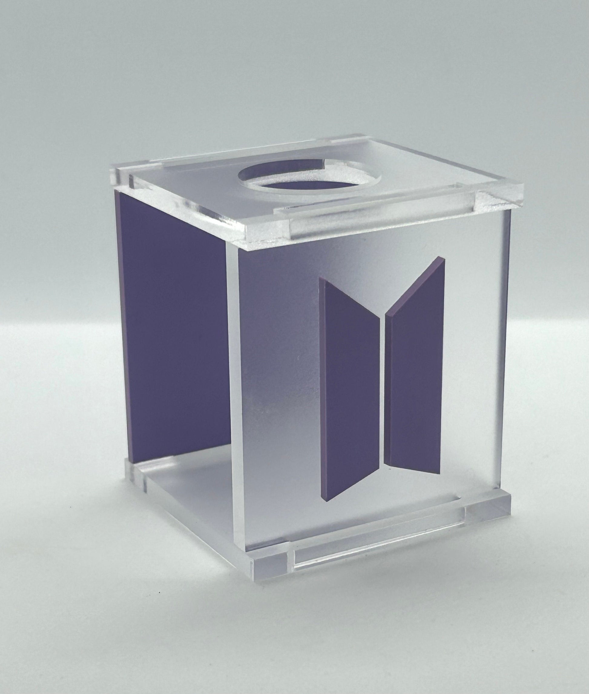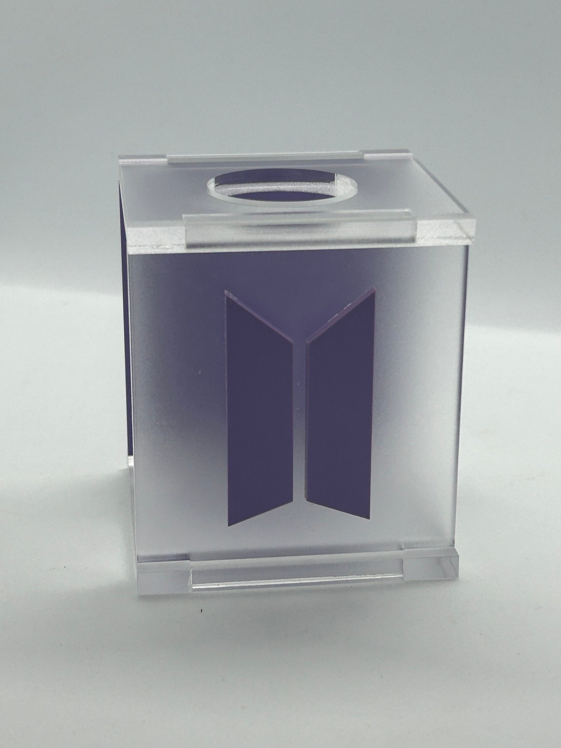 Crafted from high-quality, frosted and matte acrylic material, this lightstick holder offers a sleek and modern design that will complement any lightstick. The front is customized with a pastel purple BTS logo, which matches the back panel.