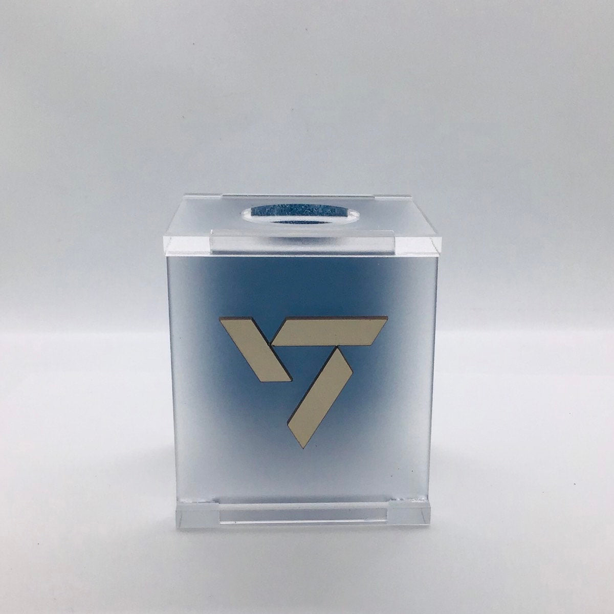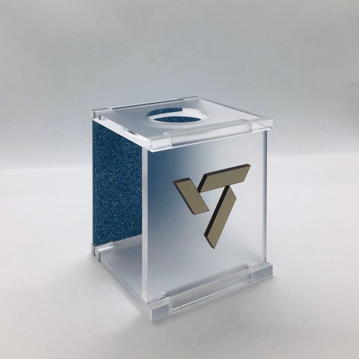 Crafted from high-quality, frosted and glitter acrylic material, this lightstick holder offers a sleek and modern design that will complement any lightstick. The front is customized with a silver metallic logo.