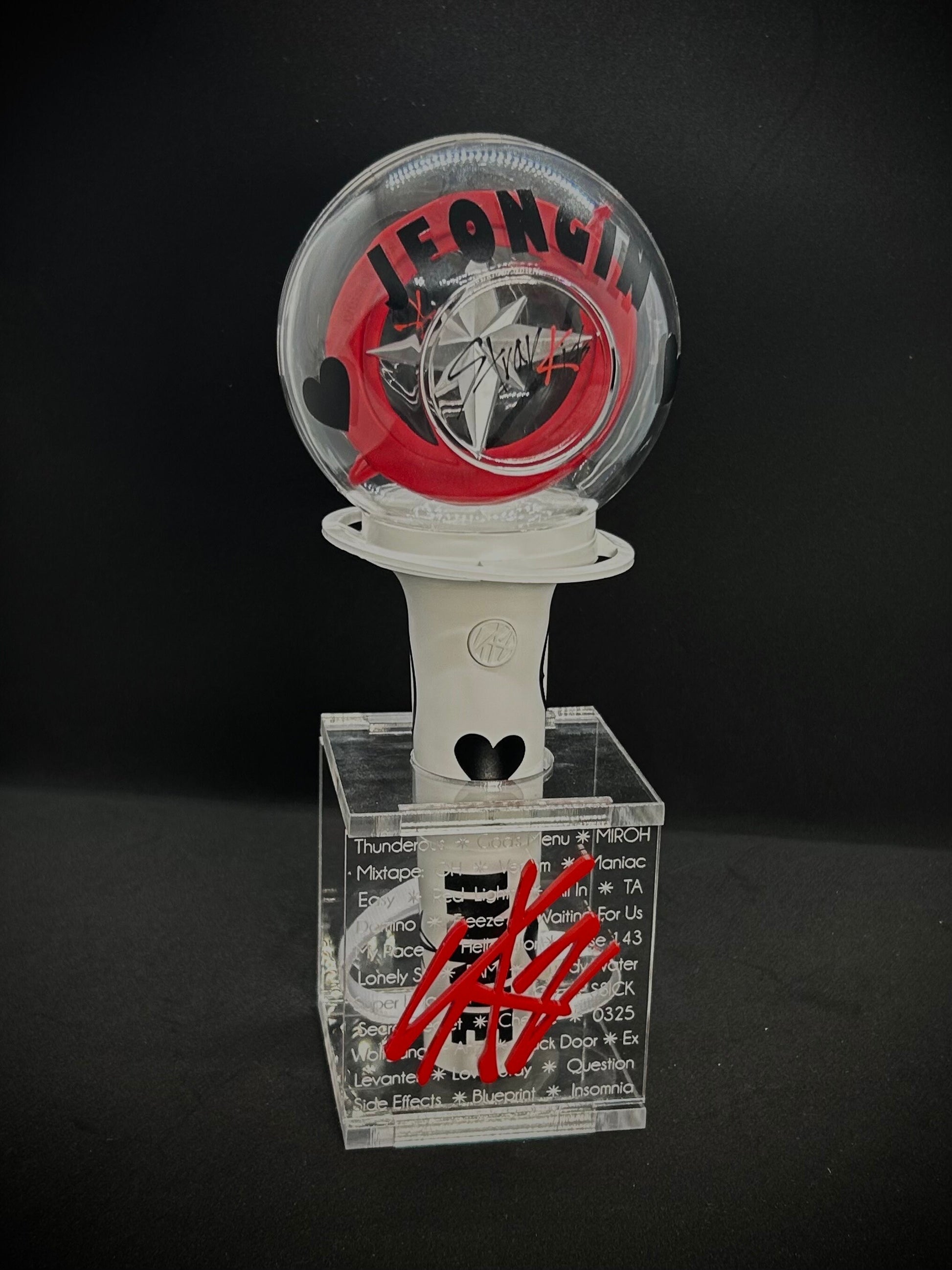 Crafted from high-quality, transparent acrylic material, this lightstick holder offers a sleek and modern design that will complement any lightstick. The front is customized with engraved SKZ songs, and a red acrylic Stray Kids SKZ logo. Want specific songs to be included? Or song lyrics? Or are you an OT8 stan who wants our favorite "Kids'" names on the front instead? No problem - just send me a message!