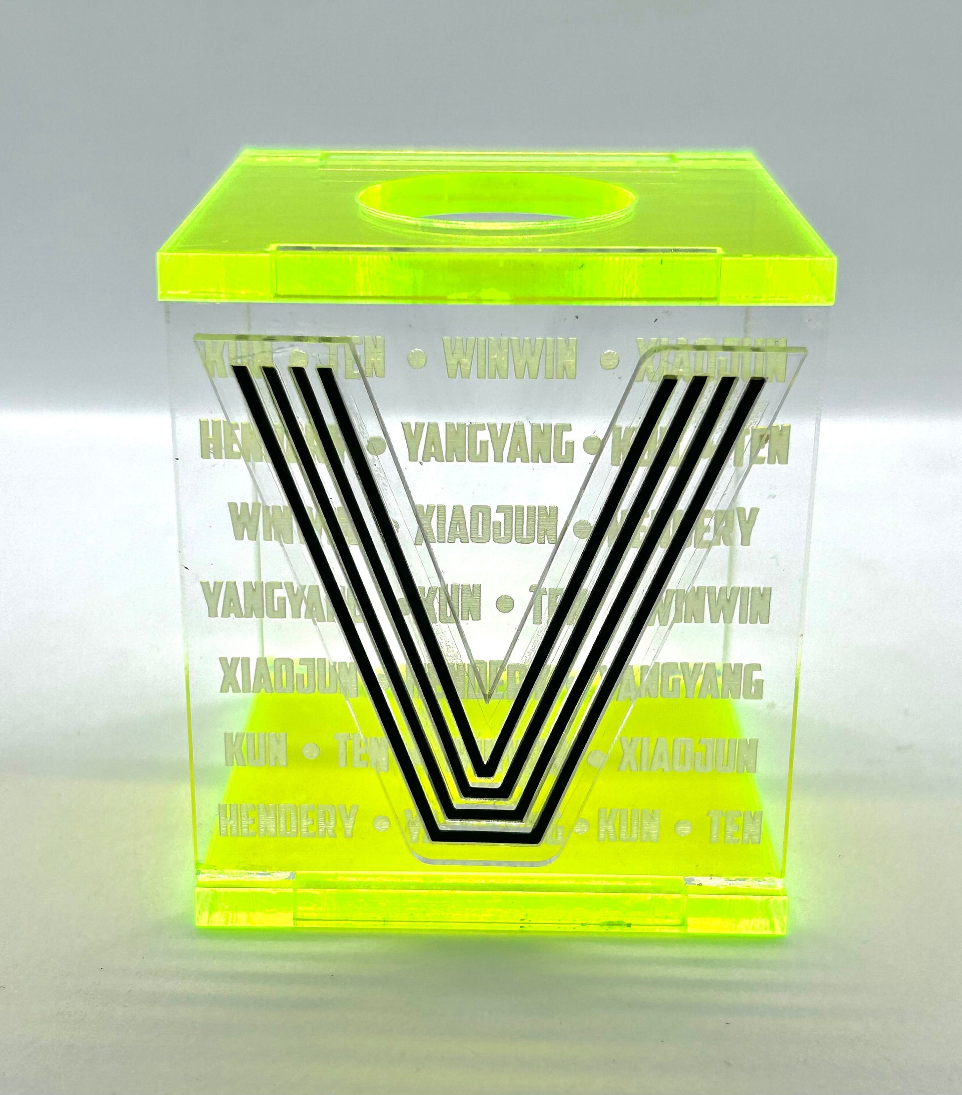 Crafted from high-quality, transparent acrylic material, this lightstick holder offers a sleek and modern design that will complement any lightstick. The front is customized with WayV’s logo and the names of our favorite guys. The top and bottom are made from lime green acrylic to match the unique color of NCT and WayV’s lightsticks. Whether you're a WayZenni or NCTZen this is a great accessory for your lightstick!